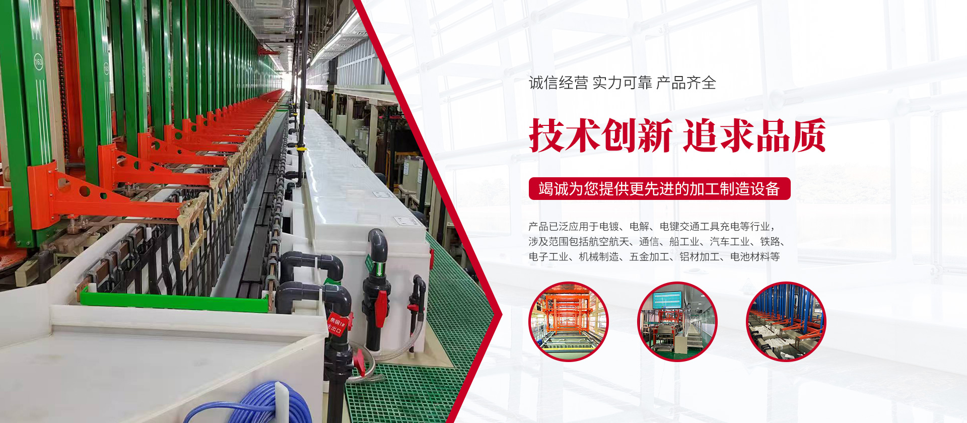 公司具備獨(dú)立研發(fā)設(shè)計(jì)制造全自動(dòng)環(huán)形垂直升降電鍍生產(chǎn)線(xiàn)、全自動(dòng)龍門(mén)電鍍生產(chǎn)線(xiàn)、全自動(dòng)爬坡電鍍生產(chǎn)線(xiàn)、工業(yè)柜式及隧道式焗爐、清洗機(jī)、風(fēng)機(jī)等全套電鍍?cè)O(shè)備交鑰匙工程的能力。產(chǎn)品已泛應(yīng)用于電鍍、電解、電鍵交通工具充電等行業(yè),涉及的范圍包括航空、航天、通信、船工業(yè)、汽車(chē)工業(yè)、鐵路、電子工業(yè)、機(jī)械制造、五金加工、鋁材加工、電池材料等。